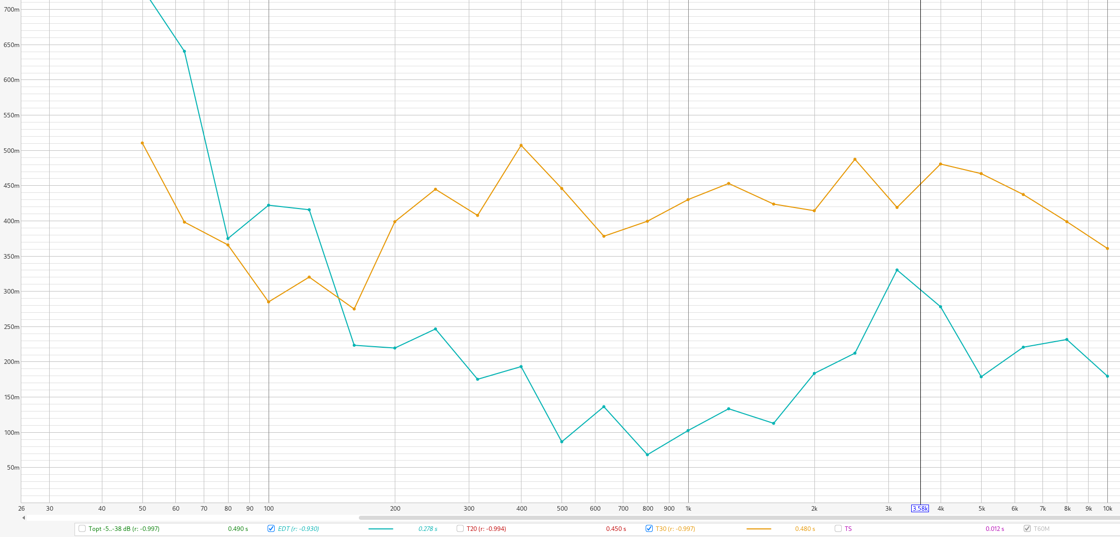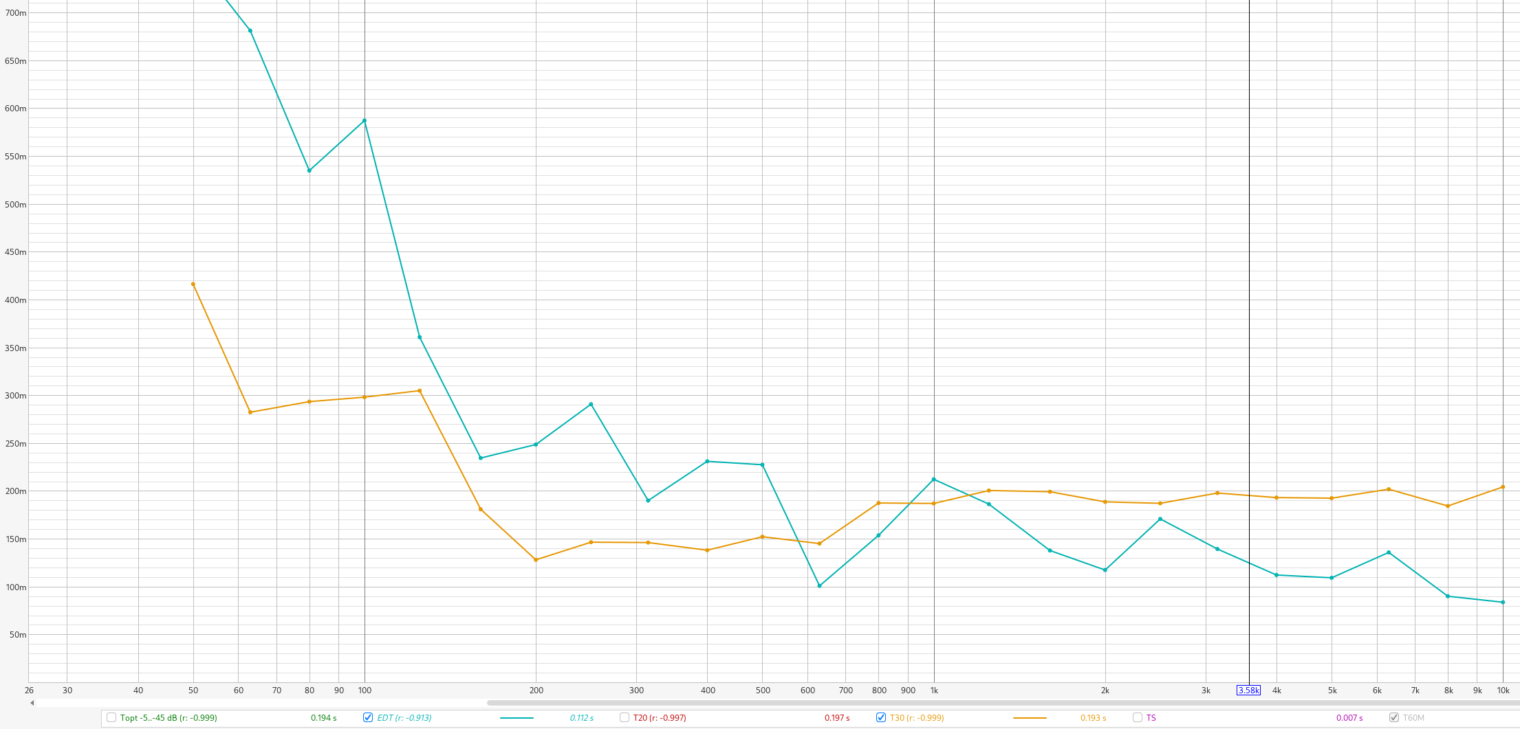 We can see how much difference acoustic treatment makes. The music room - heavily treated, having a flat RT60 (T30) <200ms from 150Hz to 10KHz. Close to a pro mixing studio or amateur mastering studio. The hard to manage bass is at most 300ms from 60 to 125Hz, reaching a maximum of 425ms at 50Hz.